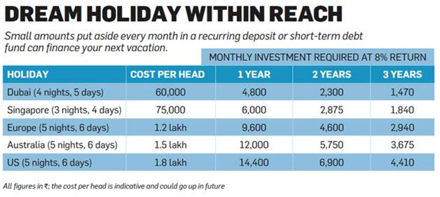 A vacation is a luxury, not a necessity. So do not holiday at the cost of savings meant for much more important goals. Similarly, do not borrow to travel. Banks can charge anywhere between 13% and 30% for a personal loan. You could land up paying stiff EMIs every month for three years for a fortnight's break.